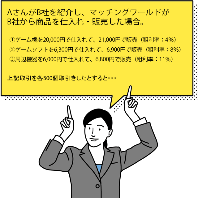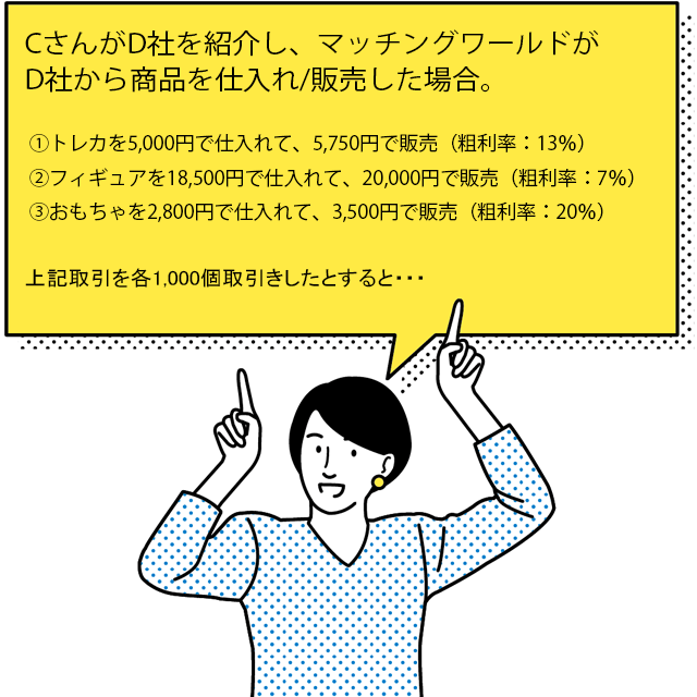メーカー・卸問屋をご紹介いただいた後、当社がそのメーカー・卸問屋から仕入れをし、その商品が販売できた場合、発生した利益額に応じて7~23%の手数料を毎月お支払いいたします。